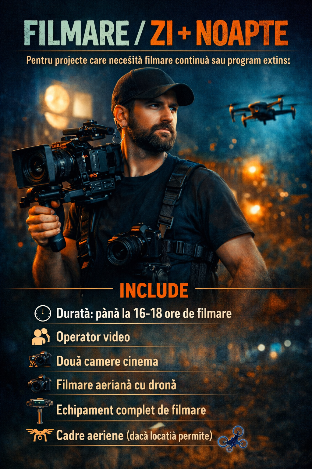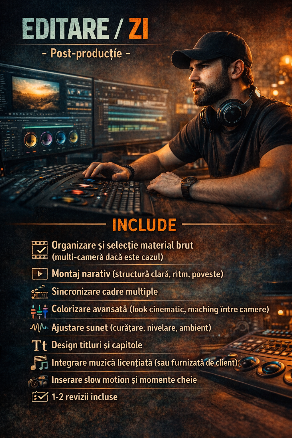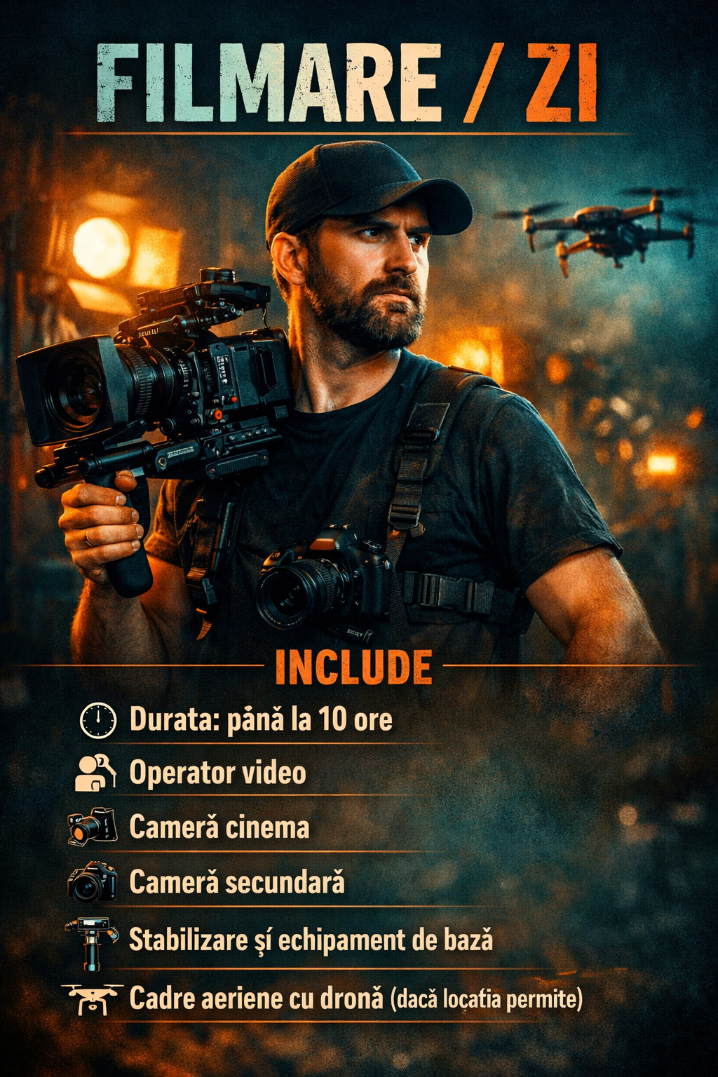 Serviciile noastre de producție video includ filmare, montaj și editare profesională pentru diverse tipuri de proiecte. De la videoclipuri pentru social media până la reclame și prezentări de business, fiecare material este realizat cu atenție la detalii și un stil cinematic modern.